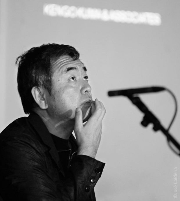 No salão de entrada da Fábrica Asa, numa construção imponente de tábuas e barrotes aparafusados segundo uma ideia estética mais ou menos conseguida, querendo lembrar uma catedral ou uma mesquita com um coração negro destinado à celebração mística das palavras, Kengo Kuma esteve ontem em Guimarães a falar da sua arquitectura de respeito à Natureza. Começou por falar da força destrutiva da Natureza, onde a fragilidade do que é construído pelo ser humano, e do próprio ser humano só consegue alguma ideia de perenidade ao assumir, paradoxalmente, o caráter transitório dos nossos esforços. A ideia de arquitetura expressa por Kengo Kuma, derivando vagamente de uma concepção existencialista desenvolvida por Heidegger no seu “Habitar, construir e Pensar” vai para lá do respeito ao local para uma concepção ainda mais reverente para com os acidentes naturais, vistos na sua ambivalente compleição de resistência e acolhimento, seja no desnível dos terrenos, obsessivamente mantidos , seja na procura da horizontalidade da água, segundo o modelo, deixando por Bruno Taut na sua passagem pelo Japão depois da ascensão de Hitler ao poder. Ouvir Kengo Kuma é partilhar do profundo respeito pelo poder do lugar, mas também do profundo respeito pelos materiais, desde a madeira que encaixa sem a violência do metal à leveza do coração das pedras. Um exemplo de grandeza e sensibilidade, sem reinventar a natureza – amando-a, apenas.